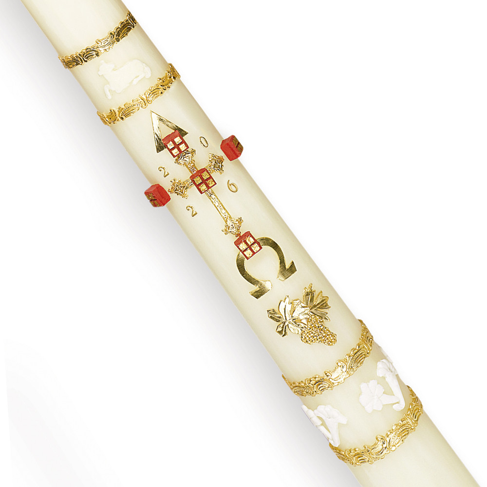 Root's Fully Ornamented Paschal Design depicts a white lamb symbolizing the "Lamb of God" at the top of the candle. The Paschal lamb is a symbol of God's deliverance of his people. The Alpha & Omega depict Christ's words from heaven, "I am the Alpha and the Omega, the first and the last, the beginning and the end." The bottom is adorned with white Easter Lilies, a symbol of Christ's Resurrection; and with Gold bands that wrap around the candle.