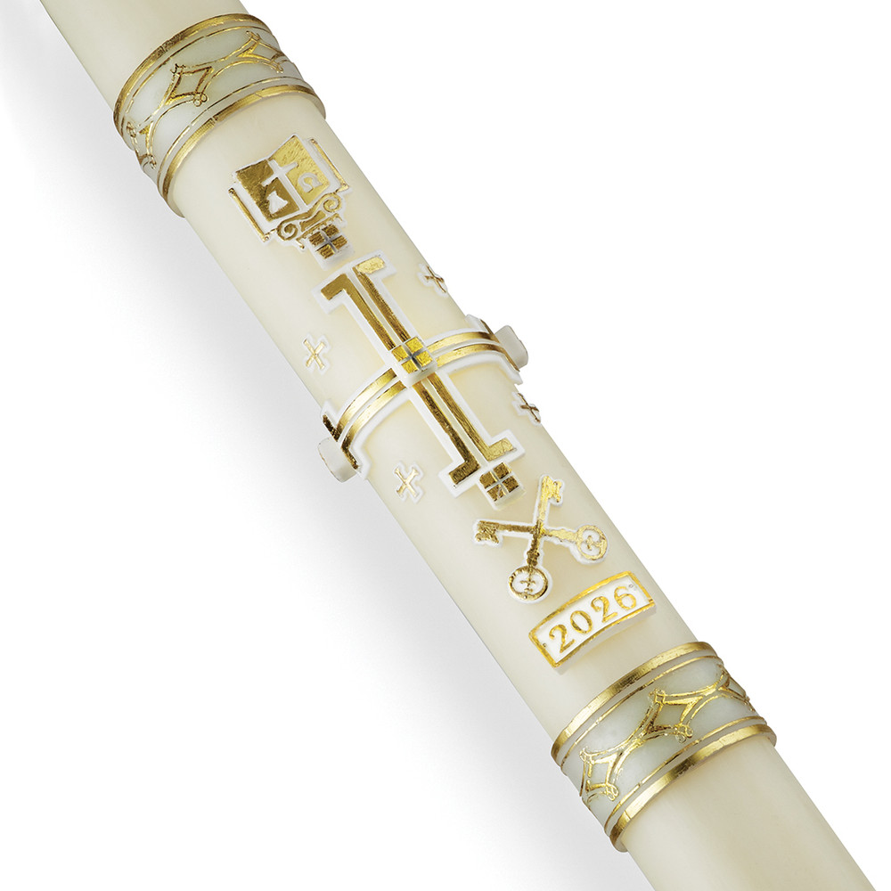 The main colors of this Paschal Candle are Gold and White.